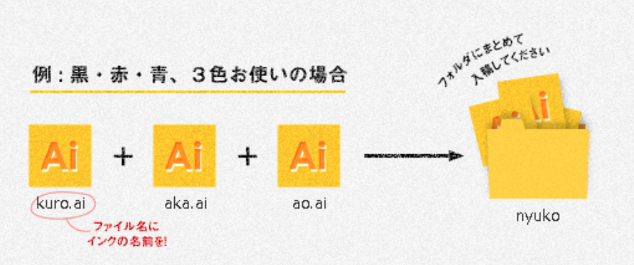 必須分別存成「黑.ai」「藍.ai」「紅.ai」三個檔案,再將三個檔案放入檔案夾,將檔案夾命名為自己的名字。如果有兩份印刷物,就必須製作兩個檔案夾。另外如果有彩色預想圖,也可以一併附上,提供我們印刷時的參考。