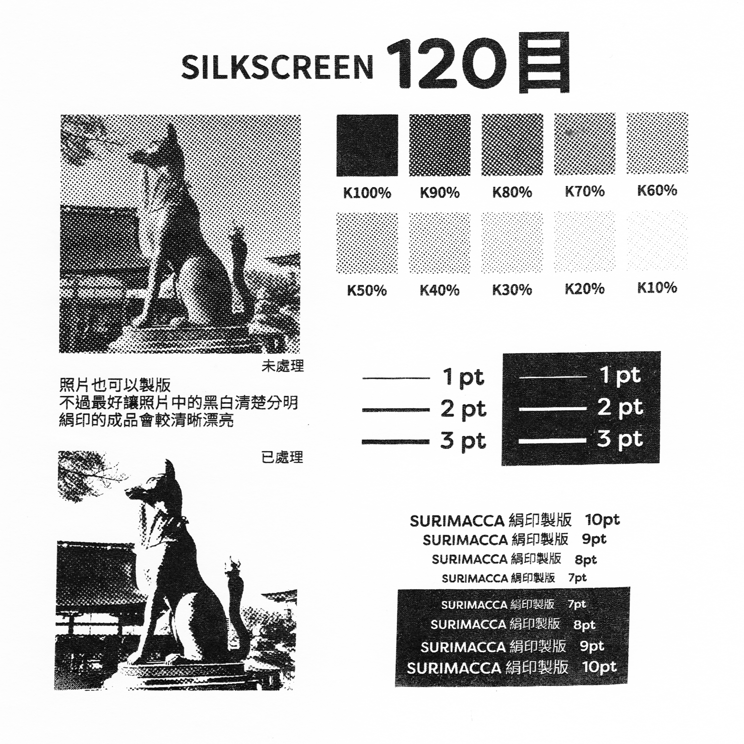 絹印原稿必須以「灰階模式」黑一色製作。黑色的部分在製版時會以孔洞呈現,油墨即可通過絹版以印製出圖案。灰階的濃度差別雖然在製版時會以孔洞的疏密呈現,但不同的軟體製作的檔案可能會有不同的效果,實際印刷時可能會無法呈現濃淡的差異而糊成一片(例如變得有點髒髒的感覺,或是有時候可能出現網花)。因此建議以黑色K100%來製作原稿,是最沒有問題的。如果想要製作濃淡的效果,建議可以用自製網點的方式。