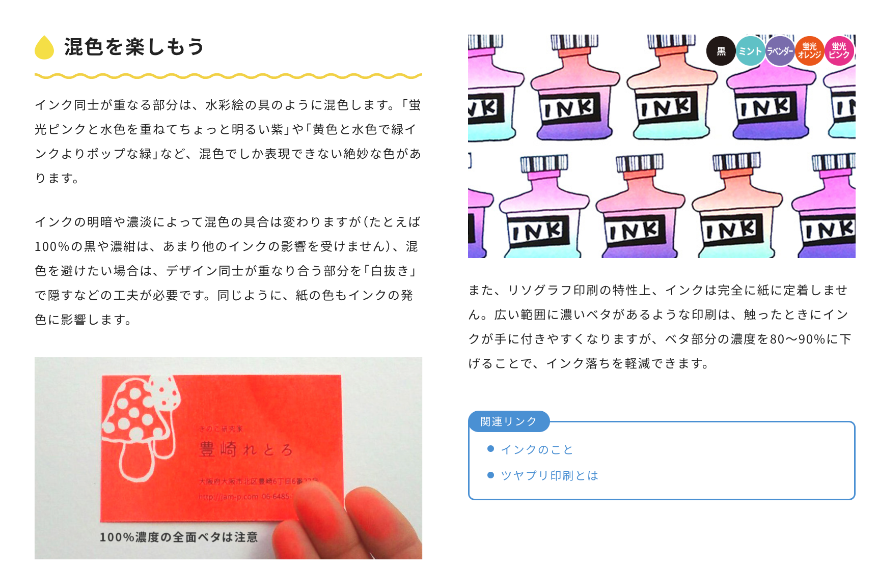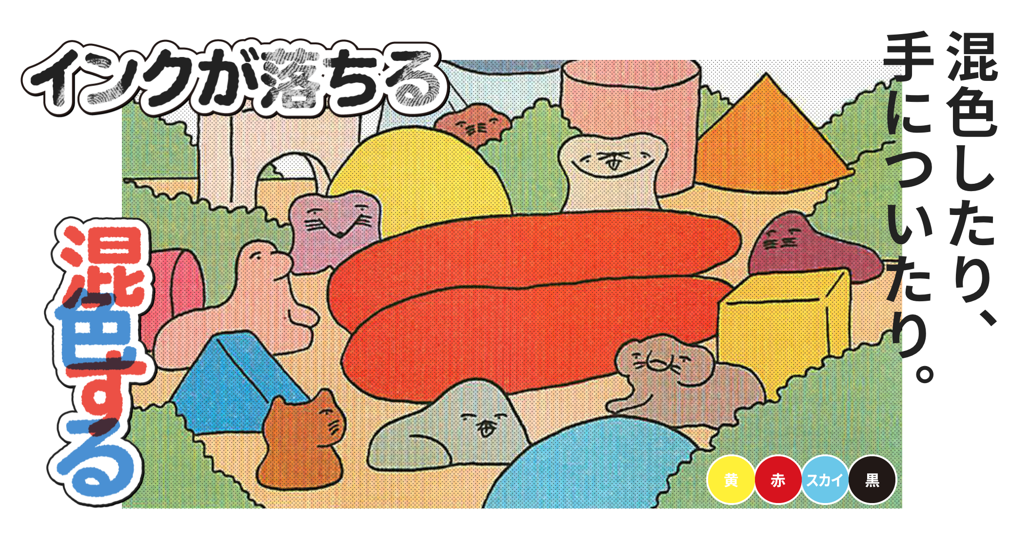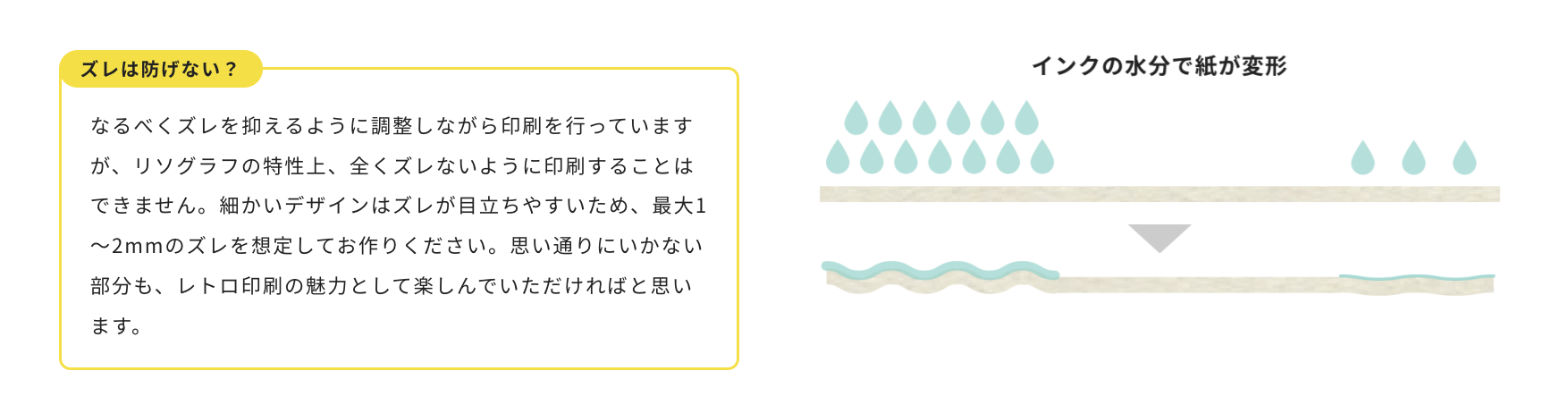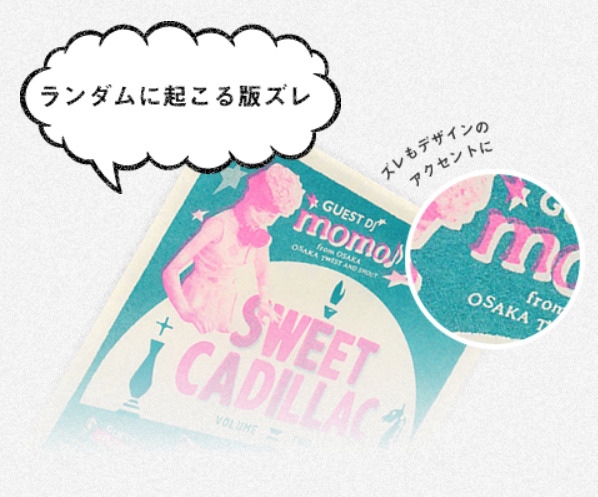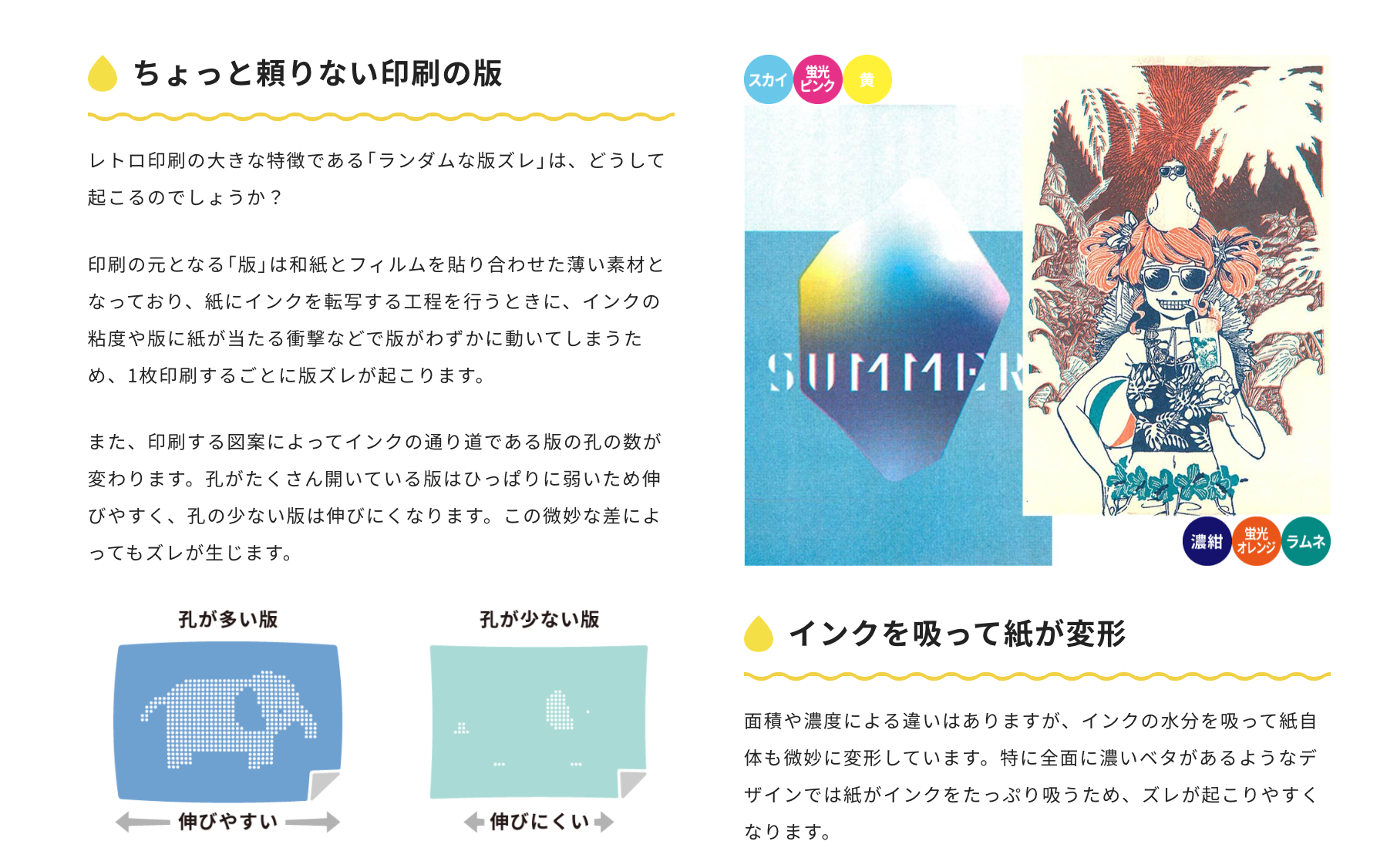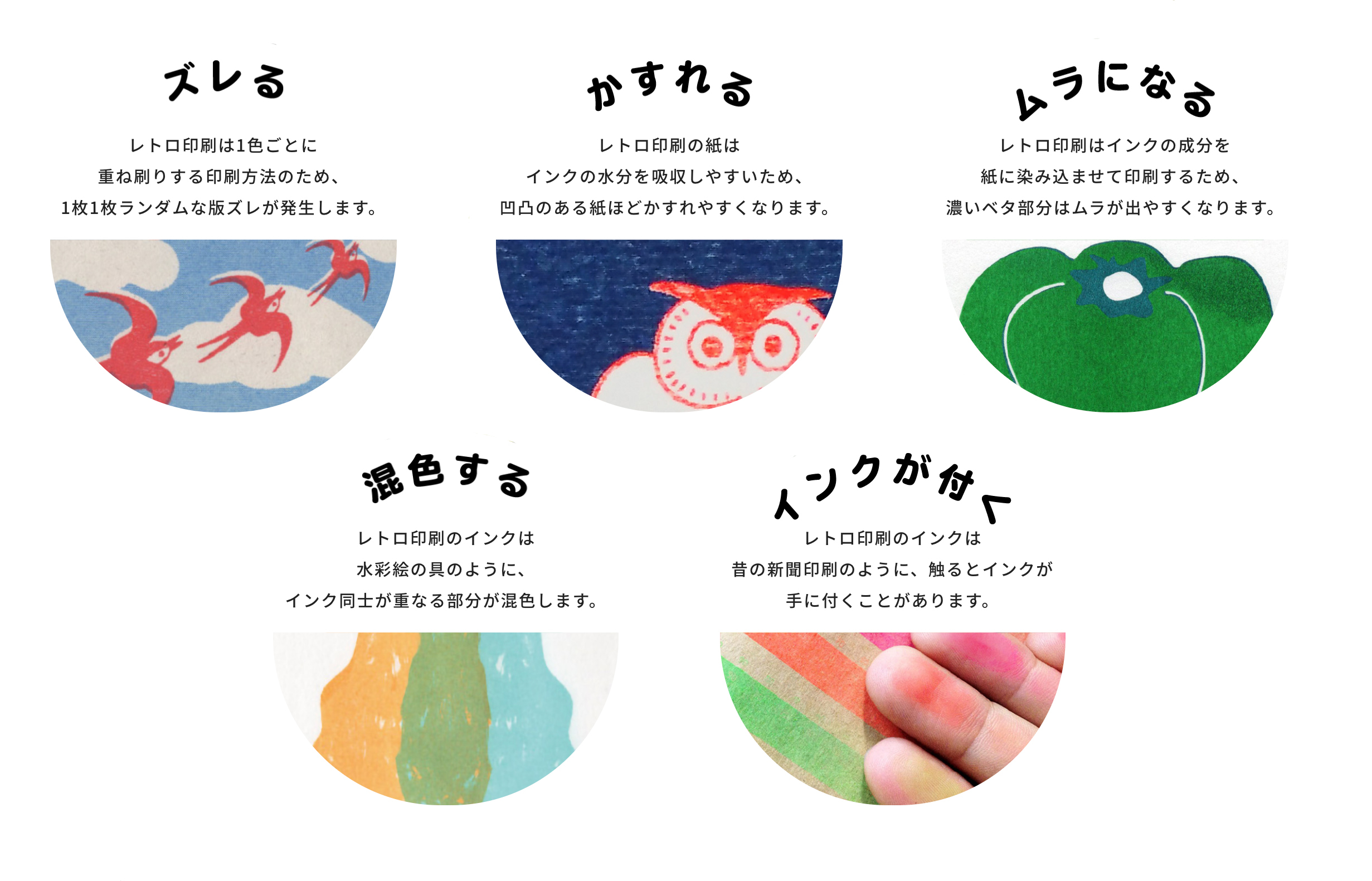 由於RETRO印刷使用的油墨為半水性(エマルジョン),油墨顏色重疊時可能會有混色效果產生。