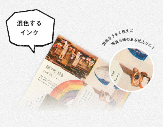 有點類似使用PHOTOSHOP的顏色乘算效果,以不同濃度設定和油墨顏色組合來混色,還可以印刷出復古感的彩色照片效果噢。