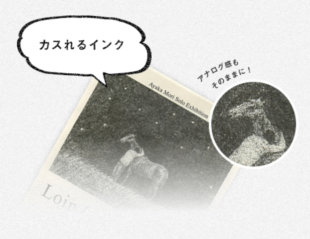 RETRO印刷的油墨的特性,容易產生擦痕或墨跡等效果。像是粉蠟筆、鉛筆等筆觸較容易表現於印刷物當中。將木炭筆畫作品掃描後再使用RETRO印刷可以印刷出非常類似的作品呢。