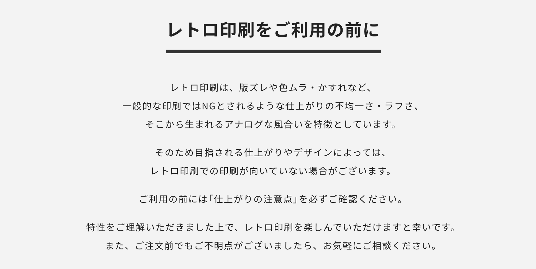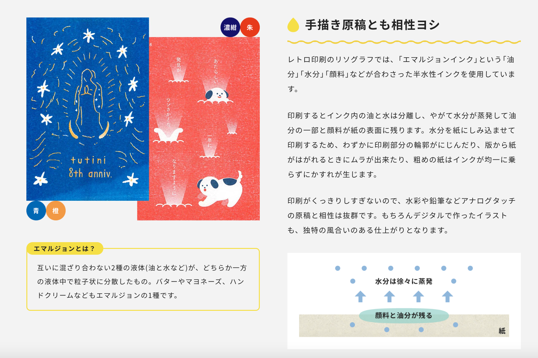 也就是平版印刷使用的是油性油墨,而RETRO印刷使用的是半水性油墨。這種油墨覆蓋在紙張上的油墨感,是只有RETRO印刷特有的有趣效果。