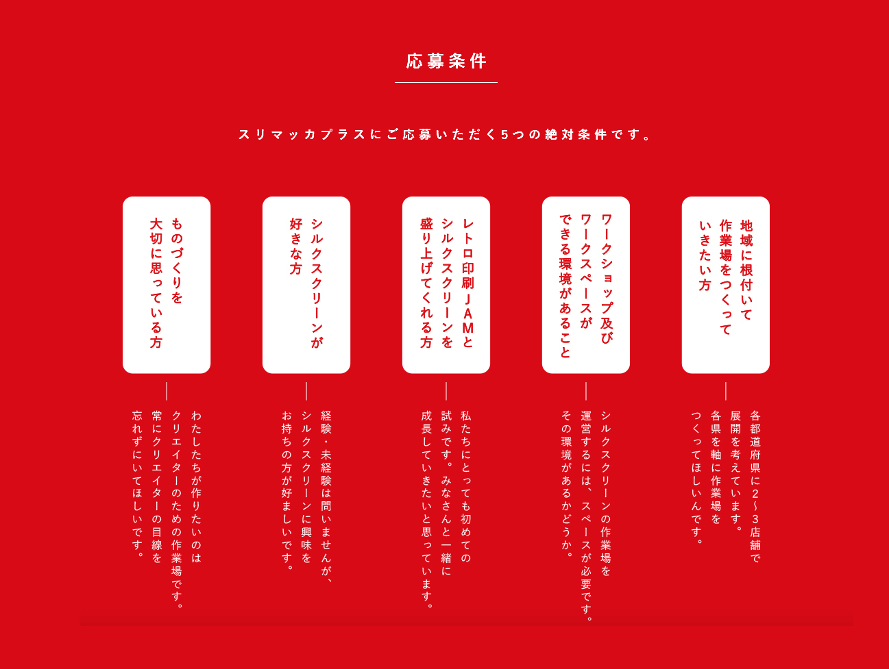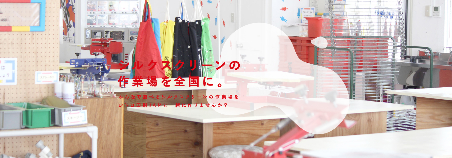 以「和印刷玩。用印刷玩。」為主要方向的日本レトロ印刷JAM,下一階段新的挑戰即是協助在日本全國、全世界各地打造絹印工作空間。希望能和大家一起使用SURIMACCA活躍絹印文化。像是你的店面空間的一部份、或是那些沒有在使用的空間,要不要一起來參加SURIMACCA+呢!