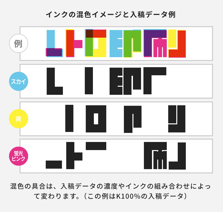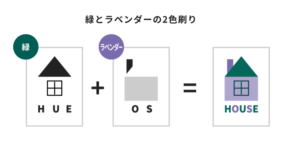 油墨互相交疊的部分會形成混色的效果,像「紅色加藍色會變成紫色」、「藍色和黃色會變成綠色」這樣的感覺,RISOGRAPH油墨的混色效果是類似水彩或色鉛筆混色的方式。例如想要使用「紅・藍・黃・紫・綠」等5色進行印刷時,也許可以利用混色的特性,使用「紅・藍・黃」3色製作出類似的效果。