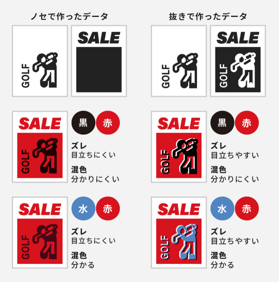 油墨重疊混色的設計稱為「疊色」(ノセ)、反之將重疊的部分挖空的方式避免混色的方式稱為「鏤空」(抜き)。