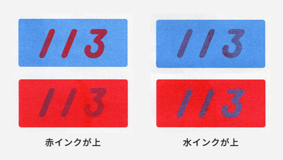 印刷順序雖然無法指定,但可以用備註例如「紅色在上、水色在下」的方式告知工作人員希望的油墨顯色效果(但也有無法完全依照希望印刷順序的情況,基本上都會以印刷物最乾淨漂亮的狀態來安排印刷順序)。