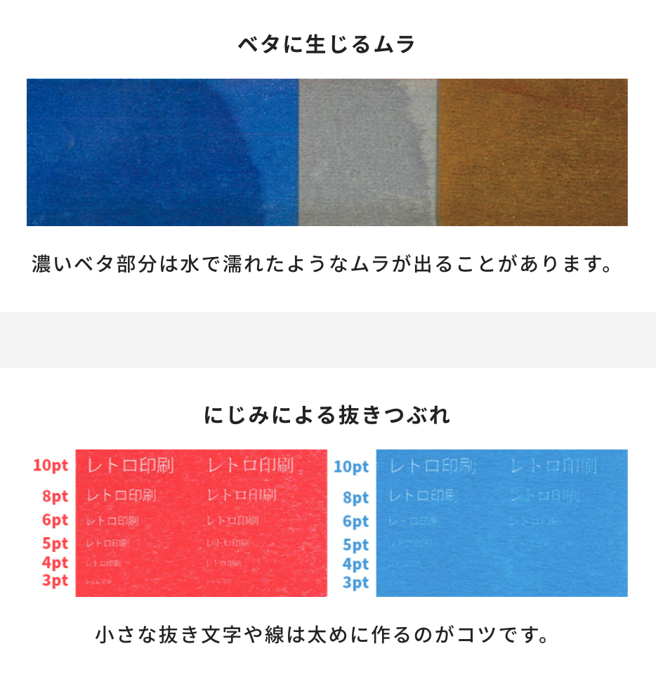 ● 由於RETRO印刷使用半水性油墨,油墨重疊的部分會形成混色。另外相同油墨在不同顏色紙張上發色程度也有所不同。
