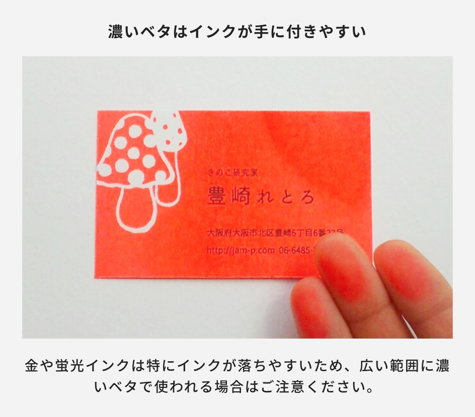 文字或線條可能比較不會感受到,但如果是有高濃度的大色塊設計時,就像是紙上塗抹了許多顏料一樣,碰觸摩擦到印刷物時,油墨很有可能或沾染到手或其他物品上(類似看報紙時手上會沾到油墨的感覺,洗手或用橡皮擦可以簡單去除)。